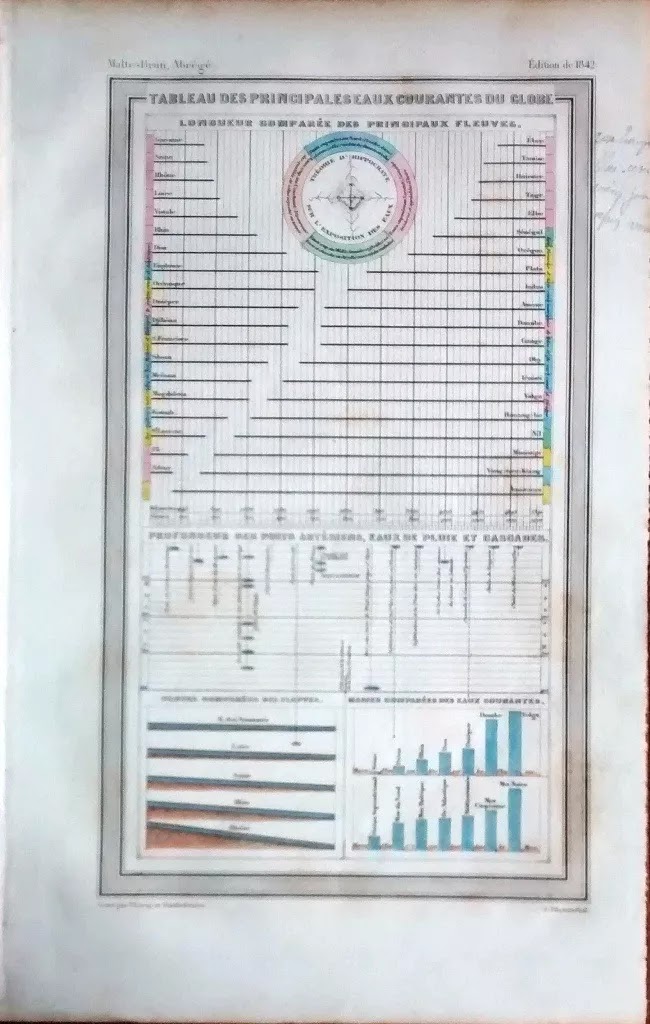 Charmoso e interessante gráfico de comparação de antiguidades de meados do século XIX, relativo à água, rios e cachoeiras. Com a cor original da mão. Tonalidades leves menores e pequenas manchas dispersas da idade, como são típicas para imagens impressas deste vintage, talvez pequenas falhas de papel menores, mas aos nossos olhos e para a maioria das pessoas, um exemplo inteiramente aceitável e bonito deste escasso e antigo gráfico. Medidas da folha 26 x 16,5 cm. Muito raro.